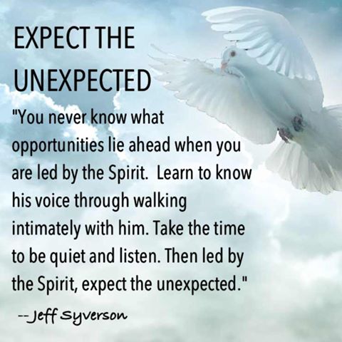 You never know what opportunities lay ahead when the Spirit leads you. Learn to know his voice through walking intimately with him. Take the time to be quiet and listen. Solitude and silence are two disciplines that are often neglected in our busy and noisy lives. Then led by the Spirit, expect the unexpected.
