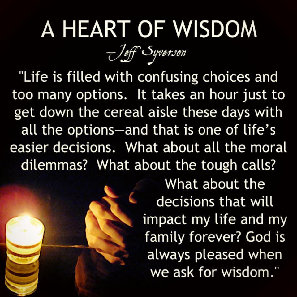 He bypassed all the selfish possibilities, and asked for the thing he most needed: wisdom. God was so pleased by his choice, that he gave him wealth, long life and honor too. All he asked for and so much more! Solomon made the choice we all need to make, he asked for wisdom. It’s a choice we need to make daily. Life is filled with confusing choices and too many options. It takes an hour just to get down the cereal aisle these days with all the options—and that is one of life’s easier decisions. What about all the moral dilemmas? What about the tough calls? What about the decisions that will impact my life and my family forever?