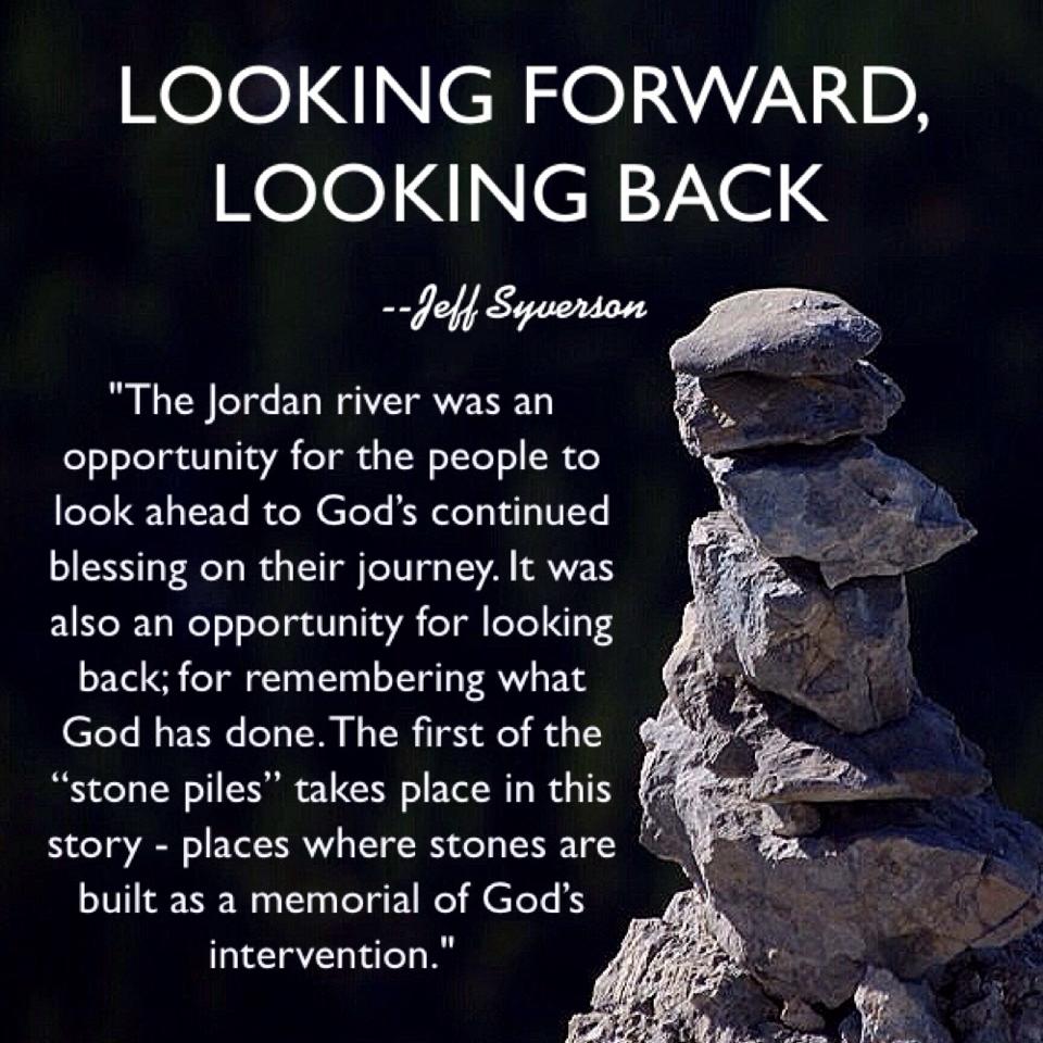 The Jordan River was also an opportunity for looking back, for remembering what God had done. The first of the “stone piles” is built in this text. There will be others in Joshua–places where stones are built as a memorial of God’s intervention–but this is the first. They were a people who quickly forgot the miracles of God (as we all do). A physical memorial was needed to pass the story on to the generations that followed.