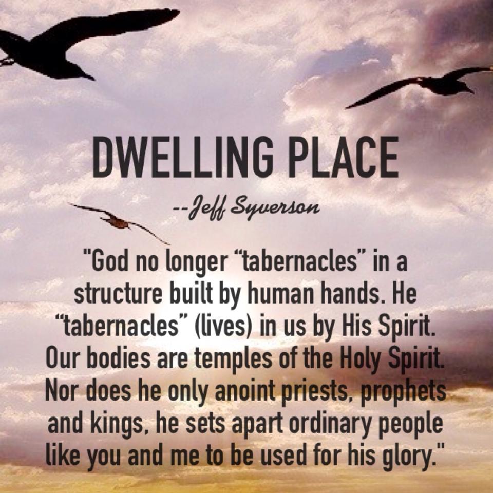 All of this is a picture of what God longs to do in us today. God no longer “tabernacles” in a structure built by human hands. He “tabernacles” (lives) in us by His Spirit. Our bodies are temples of the Holy Spirit.