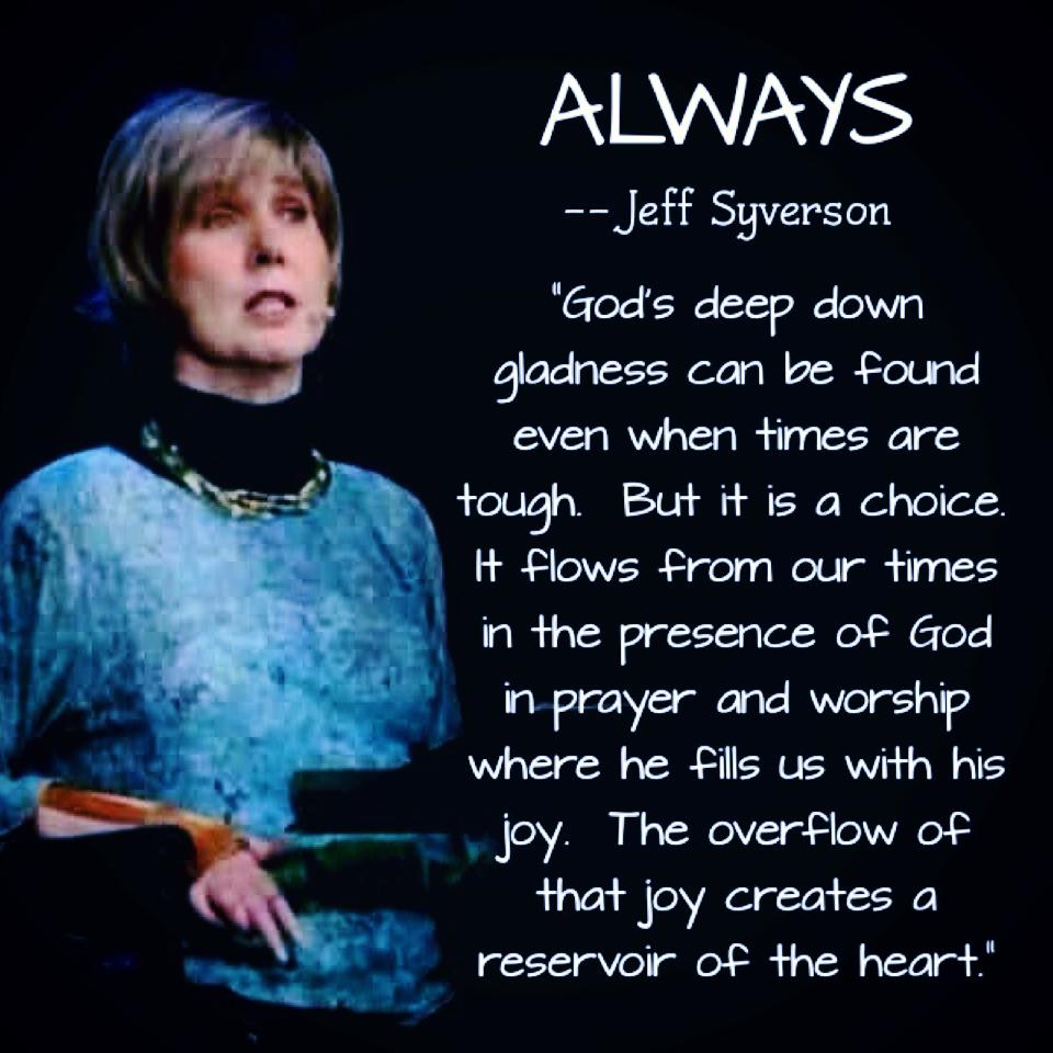 Joy is produced in us by the Holy Spirit. It flows from our times in the presence of God in prayer and worship. As we spend time in his presence, he fills us with his joy. The overflow of that joy creates a reservoir of the heart. When facing difficult times, dry times, frustrating times, we draw from that reservoir. We are able to find joy in the most unusual times and places. Yet we must keep the reservoir full, and that comes from daily fellowship with the one who loves us.
