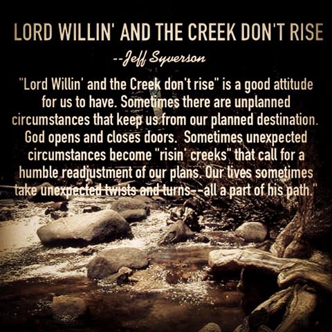 When we pray and when we seek his will, “Lord willin’ and the creek don’t rise” is a good attitude for us to have. We humbly bow our knees to Him and his plans for us. After all, his plans for us are good ones–even when he surprises us with an occasional “creek risin’” that signals a change of plans.