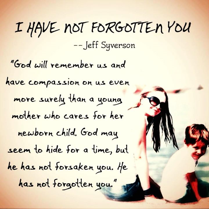 God may seem to hide for a time, but he has not forsaken you. He has not forgotten you. You are his child and he cares for you with the same loving affection given by a mother to her young child.