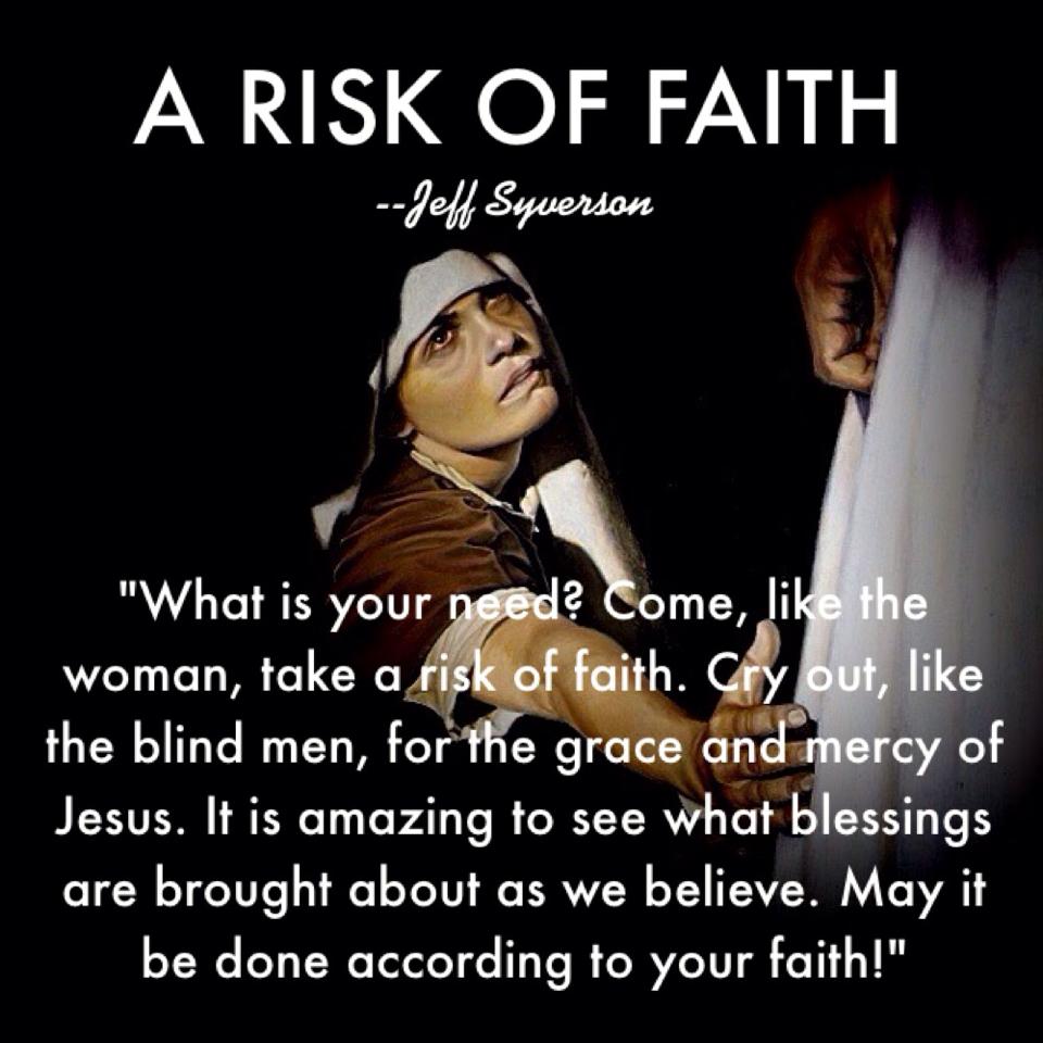 What is your need? Come, like the woman, take a risk of faith. Cry out, like the blind men, for the grace and mercy of Jesus. It is amazing to see what blessings are brought about as we believe. May it be done according to your faith!