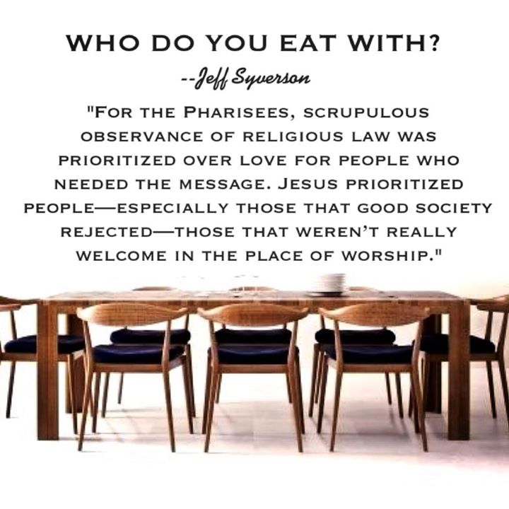 Who do you eat with? Jesus ate with tax collectors and sinners. This was a major problem for the Pharisees and other religious leaders of Jesus’ day. Jesus seemed more than willing to fuel the fire of their accusations that he was a “friend of sinners,” and someone who “eats with tax collectors and sinners.”