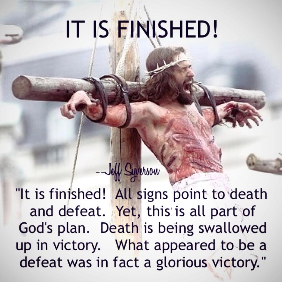 It is finished! All signs point to death and defeat. Yet, this is all part of God’s plan. Death is being swallowed up in victory. What appeared to be a defeat was in fact a glorious victory.