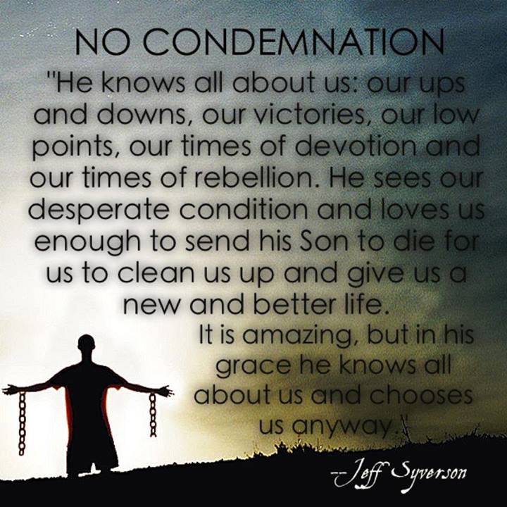 Are you living in the freedom of knowing that there is “no condemnation?” Spend time in his presence and find the life and peace that come from that truth sinking deeply into your heart. This is a truth that can set you free.