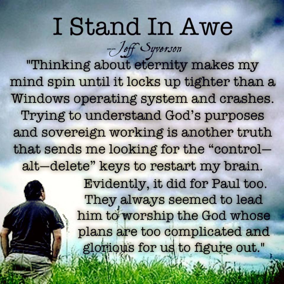 Heavenly Father, I stand amazed in your presence. Oh, the depth of the riches of your wisdom and knowledge. Your ways are higher than mine—your thoughts well beyond my ability to comprehend. So I stand in awe and worship and praise you. Guide my path today. Give me your wisdom. Allow me to walk in the reverence and awe that comes from the wonder of who you are. Amen.