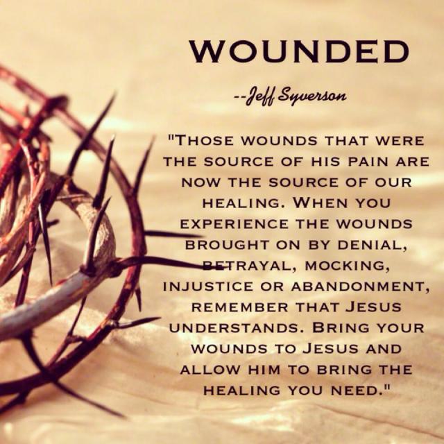 Those wounds that were the source of his pain are now the source of our healing: the forgiveness of sin, the freedom from bondages and shame, the healing of broken bodies and wounded hearts. When you experience the wounds brought on by denial, betrayal, mocking, injustice or abandonment, remember that Jesus understands. He has experienced those things too. Bring your wounds to Jesus and allow him to bring the healing you need.