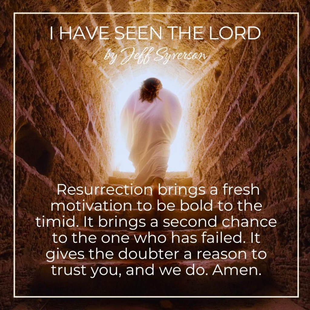 Risen Christ, we celebrate your resurrection. It brings the hope to the hopeless. It brings peace and joy to the hurting and discouraged. It brings a fresh motivation to be bold to the timid. It brings a second chance to the one who has failed. It gives the doubter a reason to trust you, and we do. Amen.