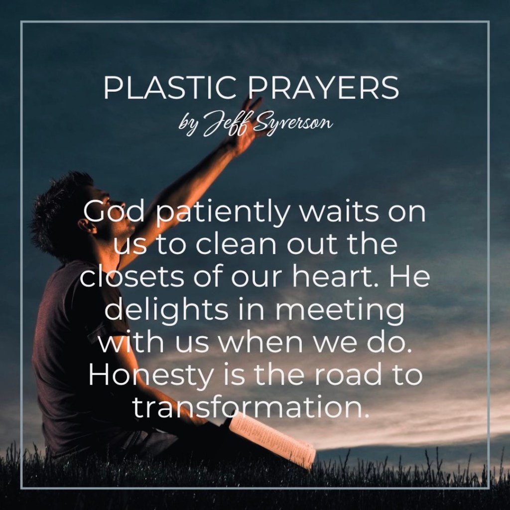 Open up your heart to God, just like David did. Get it all “out on the table,” then allow God to deal with the questions, the fears, the pain, the problems, the doubts. He patiently waits on us to clean out the closets of our heart. He delights in meeting with us when we do. Honesty is the road to transformation. We trade in our plastic religiosity to become authentic Christ followers.