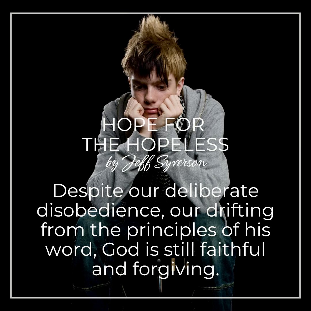 Despite our failures, our attempts to distance ourselves from God, our deliberate disobedience, our drifting from the principles of his word, God is still faithful and forgiving. He is a God of grace and mercy. He is a God of hope (Rom. 15:13). He doesn’t give up on his people—even the ones who seem hopeless. People like you and me.