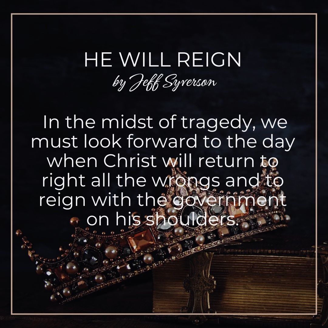 When our world seems to spin out of control, we must run back to this truth, that the Lord has established his throne in heaven, and his kingdom rules over all. In the midst of tragedy, we must look forward to the day when Christ will return to right all the wrongs and to reign with the government on his shoulders. Of the increase of his government and peace there will be no end.