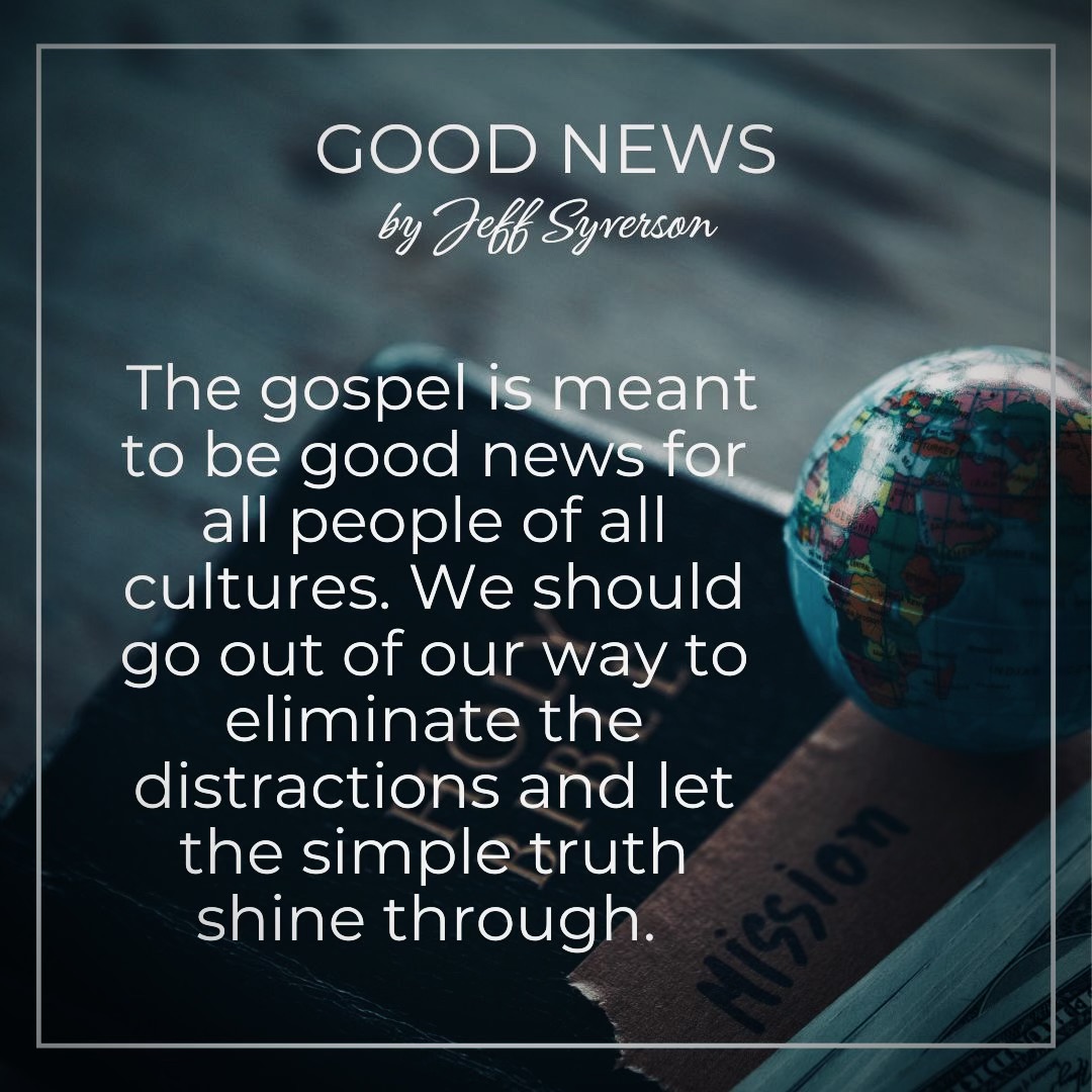 The gospel is good news for all people. We should not do anything to confuse or pervert it. We should not add to it. We should not make it more difficult through adding rules or condemnation. We should not exclude those unlike us. In fact, we should go out of our way to eliminate the distractions and let the simple truth shine through. The gospel is meant to be good news for all people of all cultures.