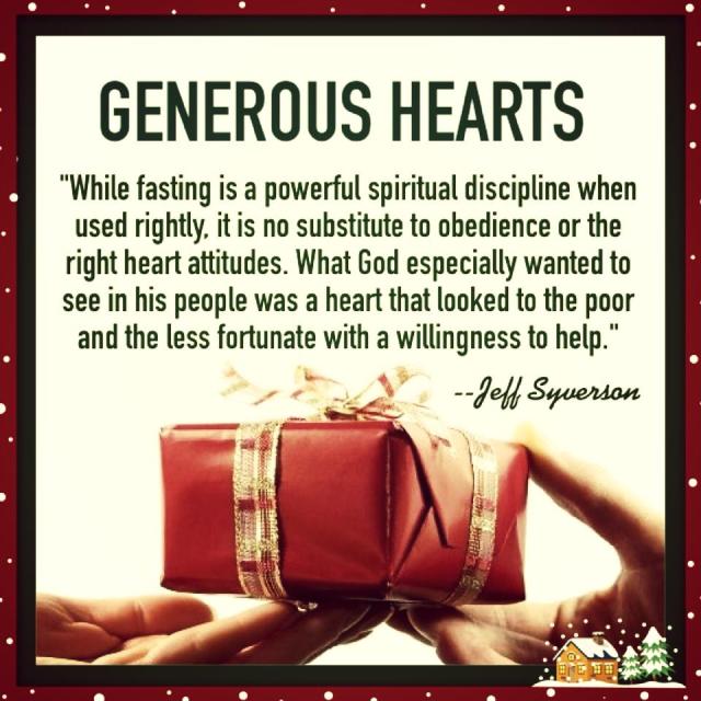While fasting is a powerful spiritual discipline when used rightly, it is no substitute to obedience or the right heart attitudes. What God especially wanted to see in his people was a heart filled with justice, mercy and generosity; a heart that looked to the poor and the less fortunate with a willingness to help.