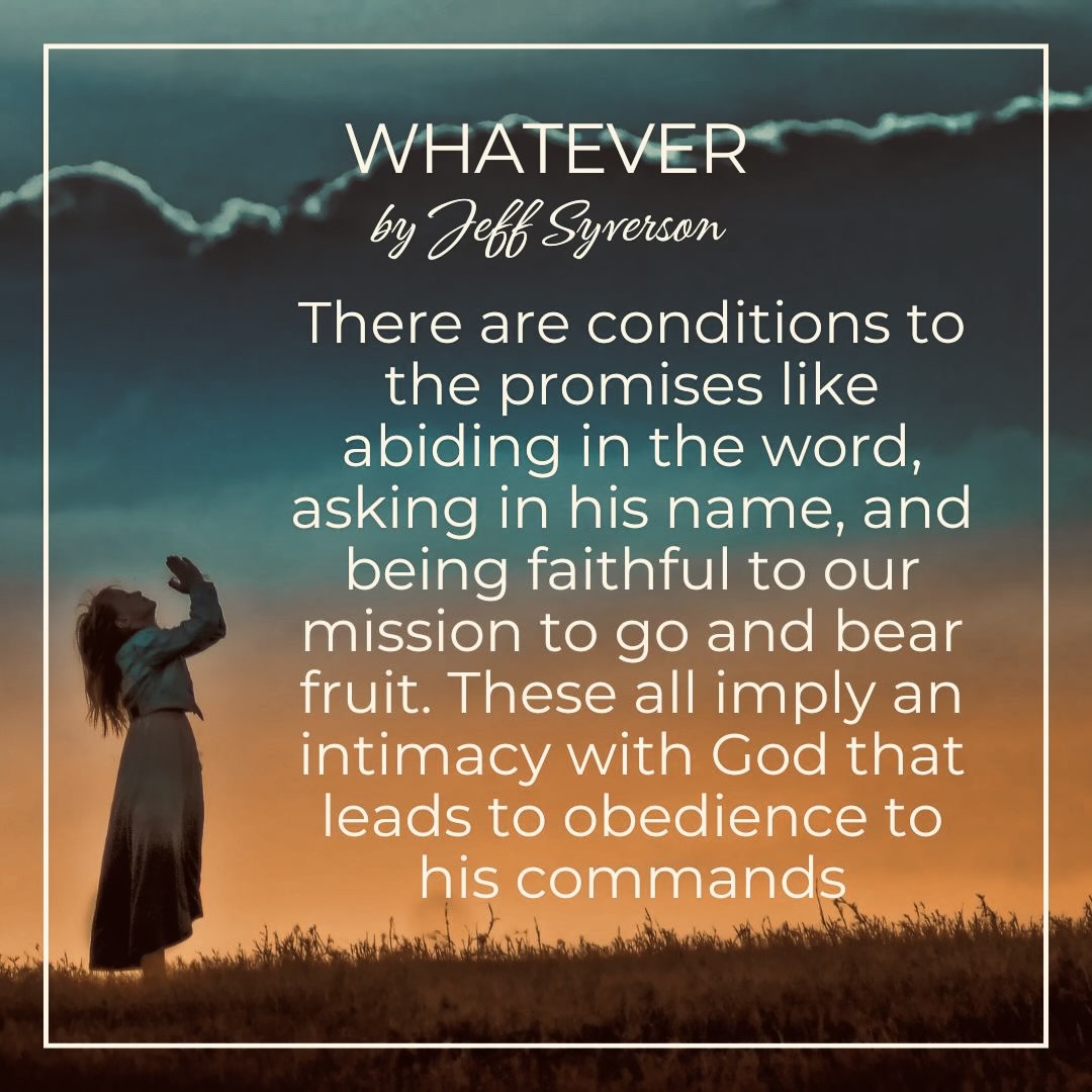 Yes, there are conditions to the promises like abiding in the word, asking in his name, and being faithful to our mission to go and bear fruit. These all imply an intimacy with God that leads to obedience to his commands—a familiarity with God’s will, both his heart and his word. Yet the promises are amazing: “Whatever you ask.”