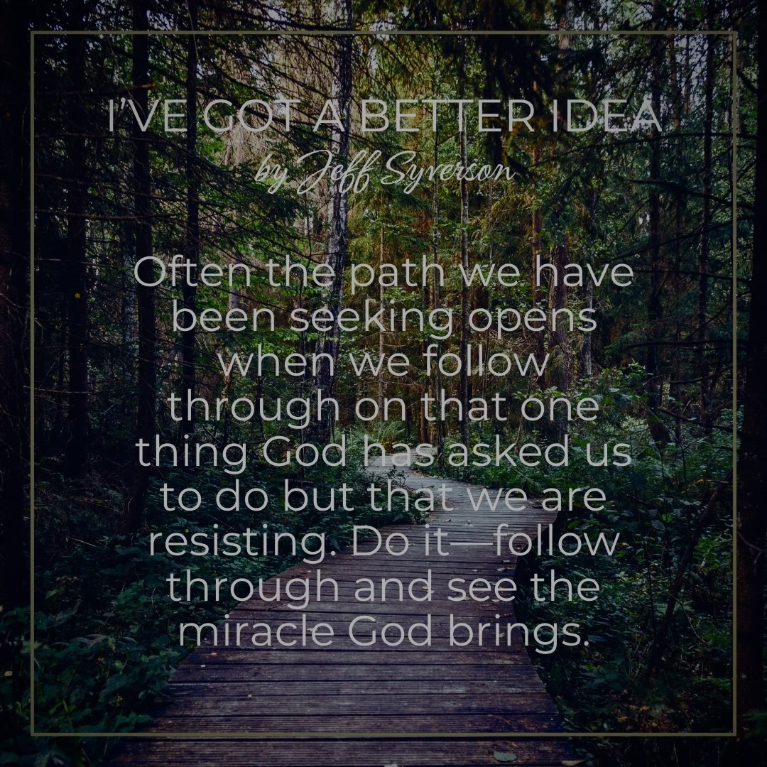 The answer comes as we humbly submit to the acts of obedience that the Lord sets out in front of us. Often the path we have been seeking opens when we follow through on that one thing God has asked us to do but that we are resisting. Do it—stop resisting, complaining, or trying to dictate alternate scenarios—follow through and see the miracle God brings.