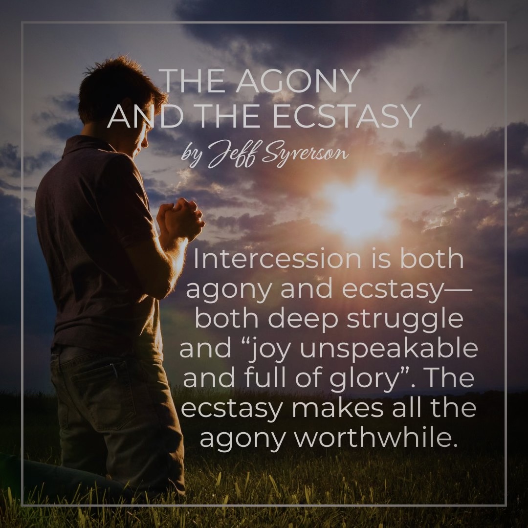 Intercession is both agony and ecstasy—both deep struggle and “joy unspeakable and full of glory” (1 Peter 1:8). Open your heart to Jesus, feel the burdens of his heart and allow him to teach you to pray. He has much to teach you. The ecstasy makes all the agony worthwhile.
