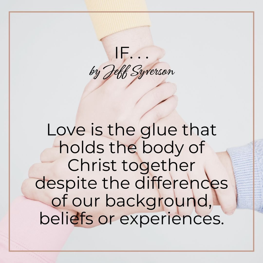 Love is the glue that holds the body of Christ together despite the differences of our background, beliefs or experiences. Often people get bent out of shape regarding spiritual gifts. Love enables us to work together and learn from each other. Some in the body bring discernment to extremes; others help bring openness to the true working of God. As we love each other, we learn from each other. Gifts are given to build up the body, not to tear it apart. As we serve in love, that is exactly what happens.