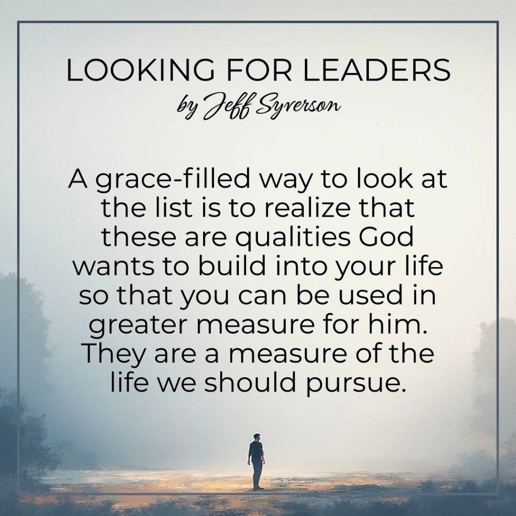 What is your reaction to reading the list? Do you say, “I could never be a leader” or “I don’t want to be a leader”? I hope not. I’m not sure that Paul intended for this to be a checklist for disqualification—and it is sometimes viewed that way. I’m sure each of us could find a point or two (or more) that would disqualify us if we looked at the list so rigidly. A grace-filled way to look at the list is to realize that these are qualities God wants to build into your life so that you can be used in greater measure for him. They are a measure of the life we should pursue.